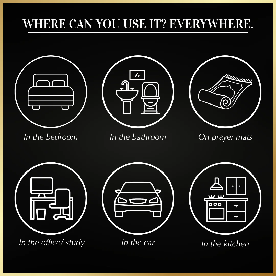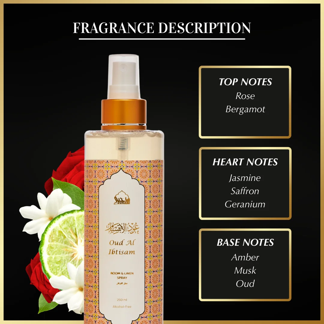 Refresh your space in just 5 minutes with our non-alcoholic oud room and linen spray. This 250ml Mist Spray offers a gentle yet captivating fragrance for fabrics, furniture, and prayer mats. Pure, safe, and versatile, it doubles as a room, linen, and car spray—bringing effortless freshness whenever you need it.