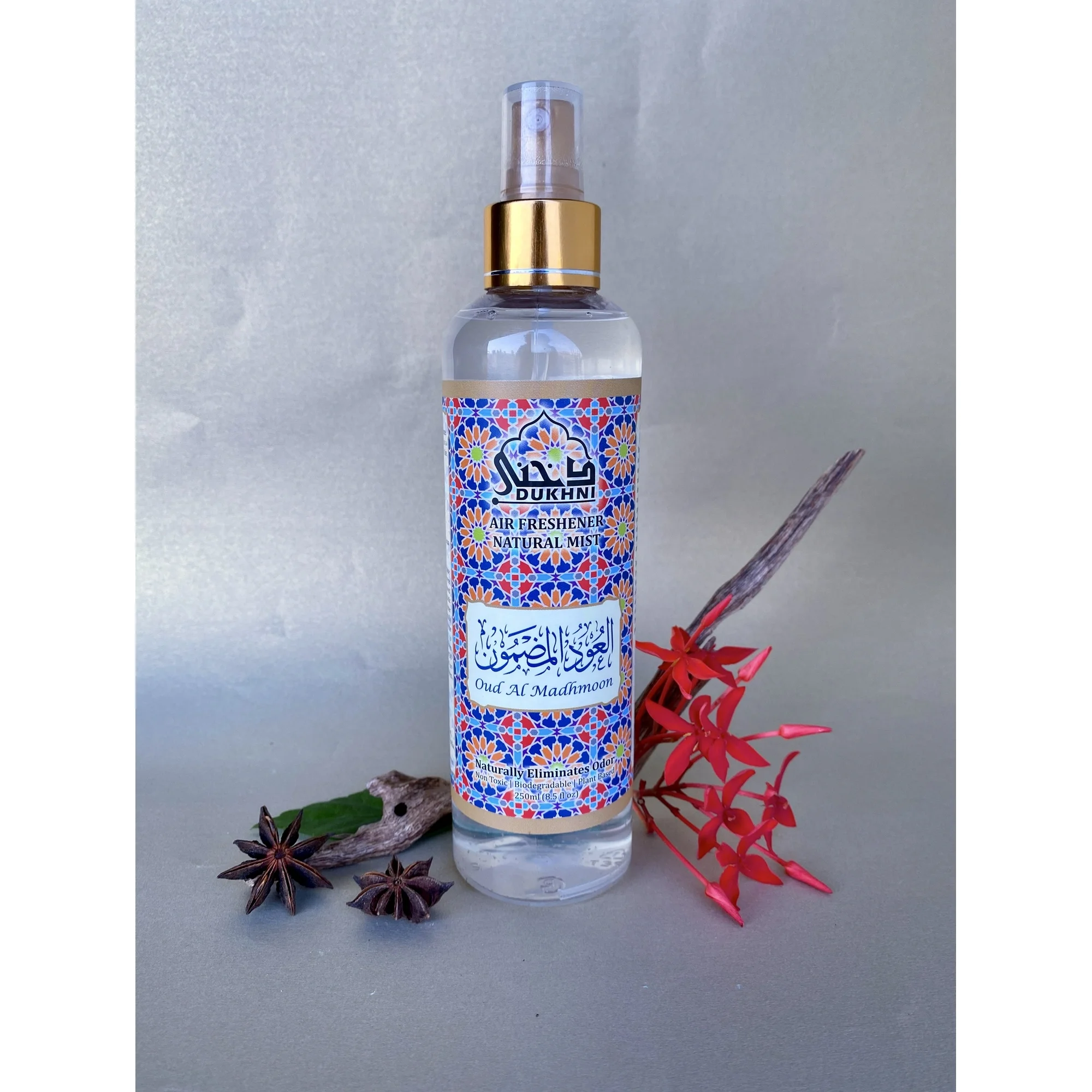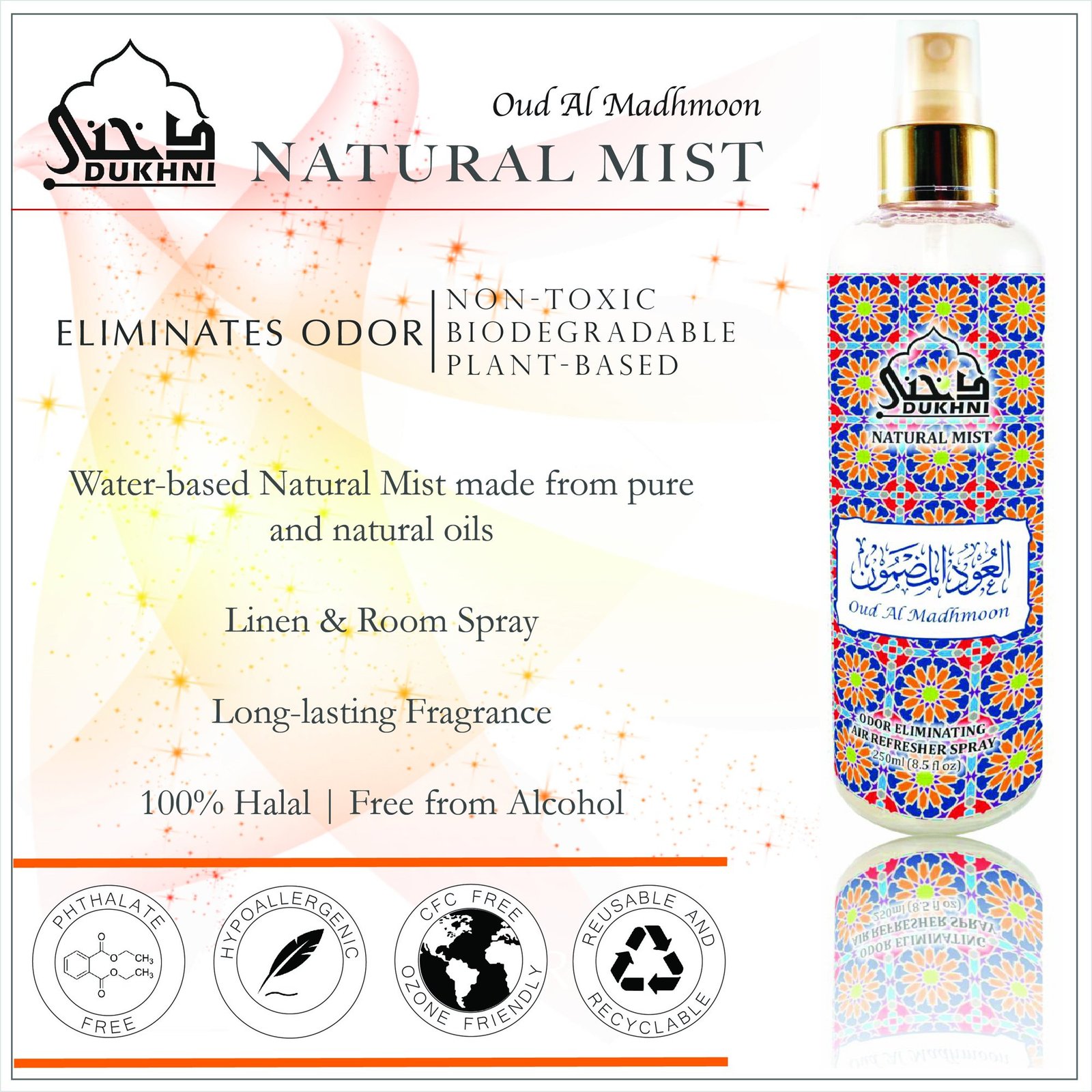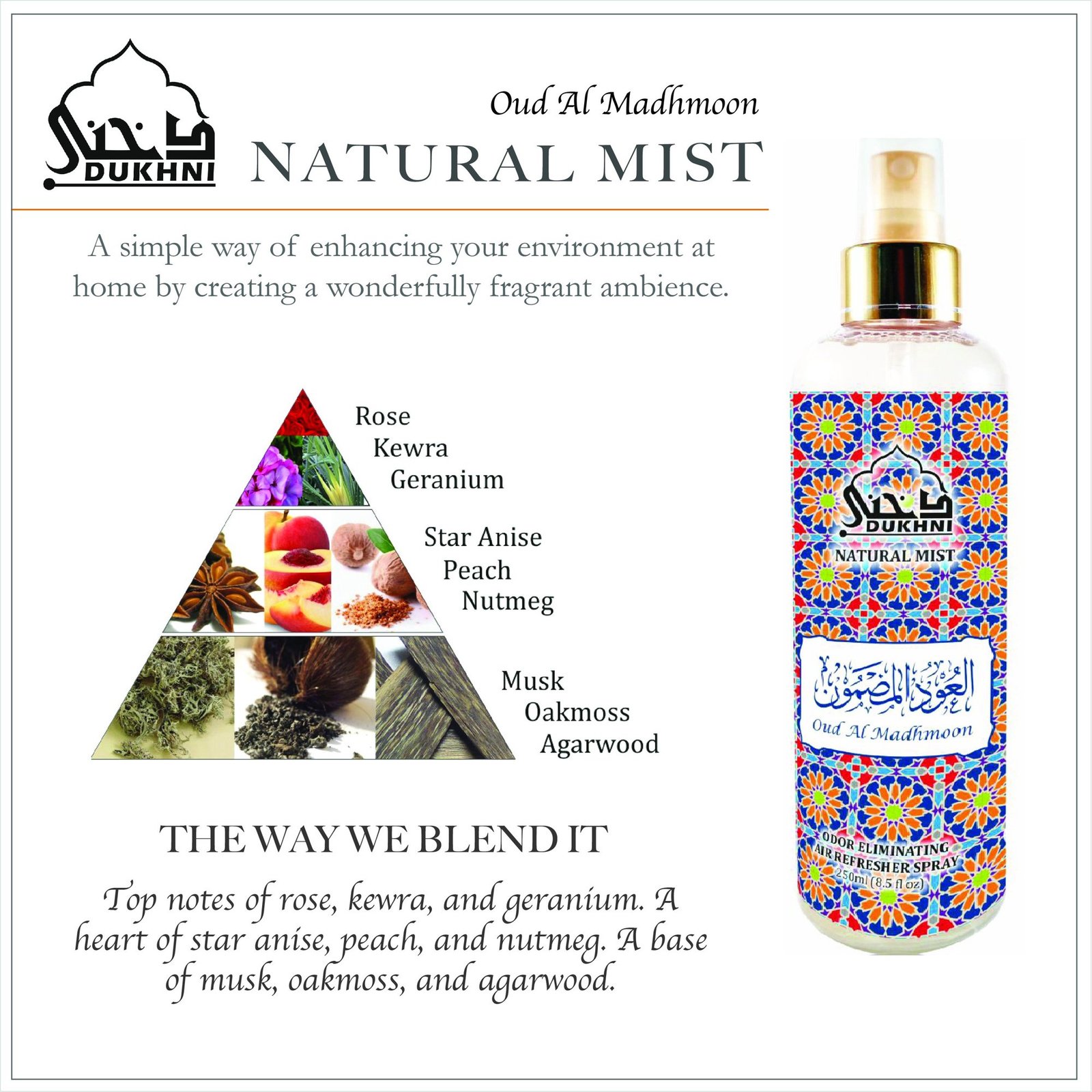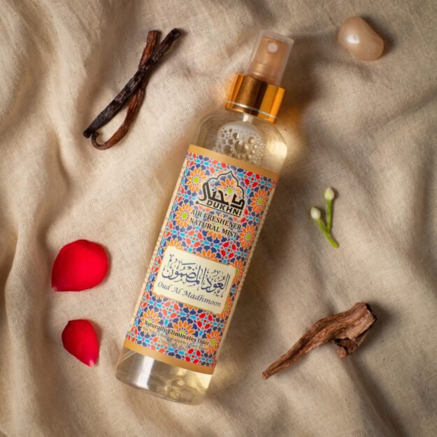 - With top notes of rose and geranium followed by a juicy heart of peach and nutmeg, the Oud Al Madhmoon natural mist is an ode to the leisurely days of summertime. A light, sensual base of musk, oakmoss, and agarwood rounds off this fresh, fruity scent. Oud Al Madhmoon natural mist is a non-alcoholic fabric and room spray that’s easy and convenient to use.
